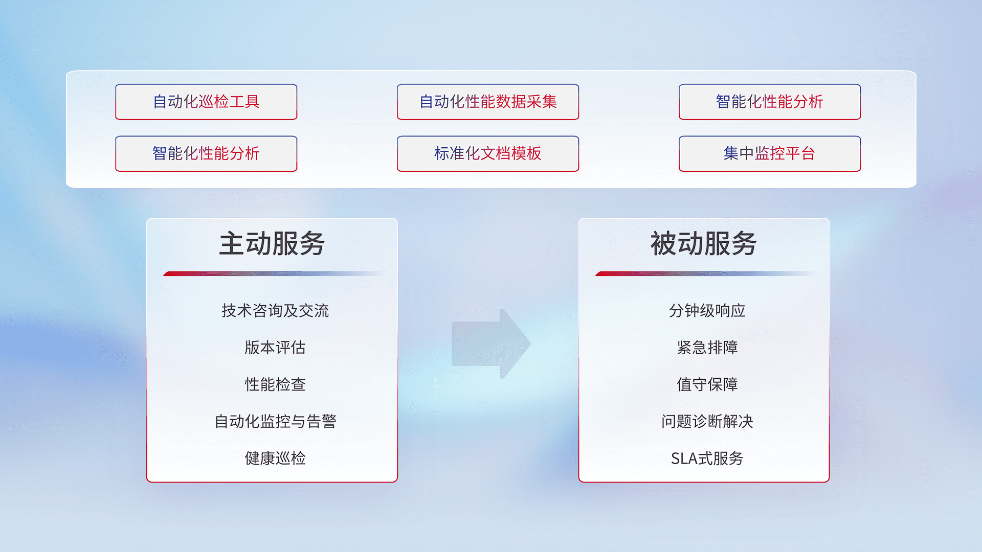 智能化工具和标准化文档,,保障服务质量,,,,提供主动服务(包含技术咨询、、、、版本评估、、性能检查、、、自动化监控与告警、、健康巡检)和被动服务包含(分钟级响应、、紧急排障、、、、值守保障、、、问题诊断解决、、、、SLA服务)。。。