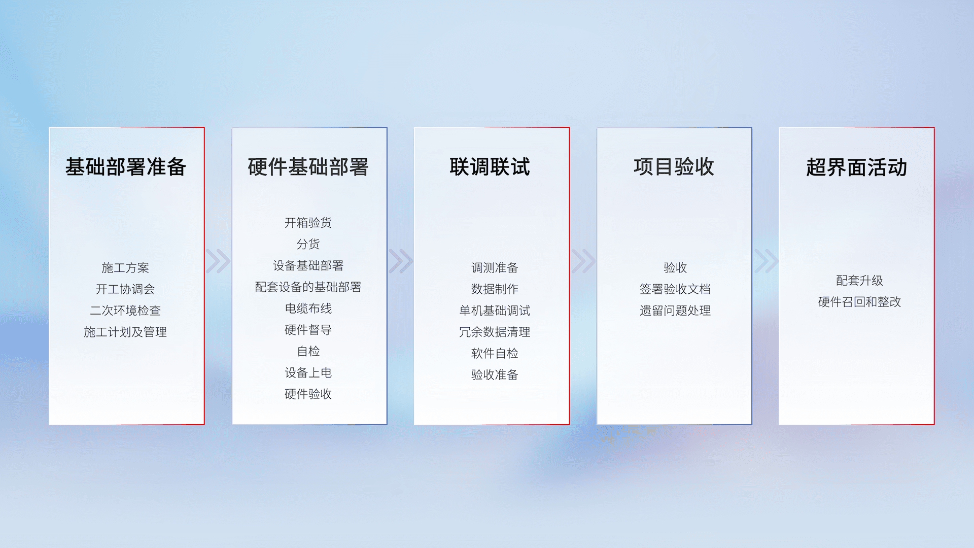 从基础部署准备、、、硬件基础部署、、、联调联试、、、项目验收、、、越界面活动的全过程可追溯,,,保证施工质量和进度。。